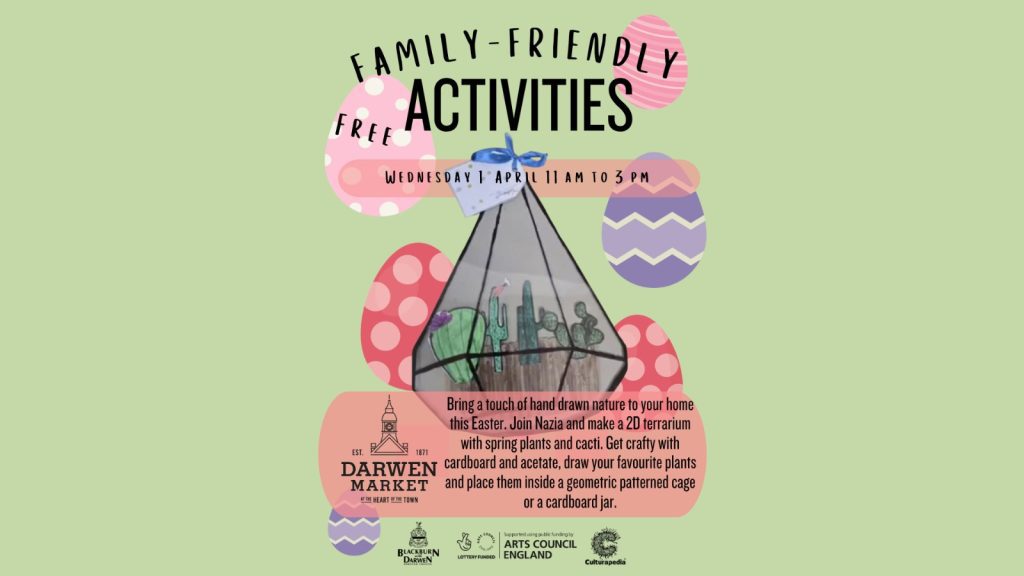 The next free Easter activity at Darwen Market will take place on Wednesday 1st April, and it’s a drop-in workshop running from 11am till 3pm. Create a 2D terrarium to take home and brighten up your Easter holiday! Let your creativity soar and draw your favourite plants and place them inside a geometric patterned cage or a cardboard jar.