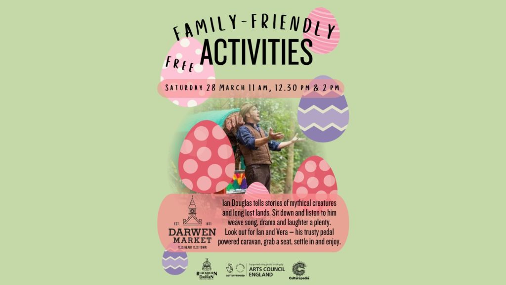 The fun starts this Saturday, 28th March, with Stories with Ian at Darwen Market, perfect for those with vivid imaginations! Join us in the market hub (opposite Candy Rush), get comfy and enjoy tales of mythical creatures and long lost lands. Ian intertwines song, drama and laughter into his storytelling for a totally captivating experience.