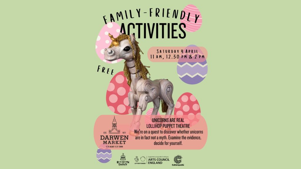 On Saturday 4th April, Lollihop Puppet Theatre group will be paying a visit to Darwen Market to perform their new show, Unicorns are Real.